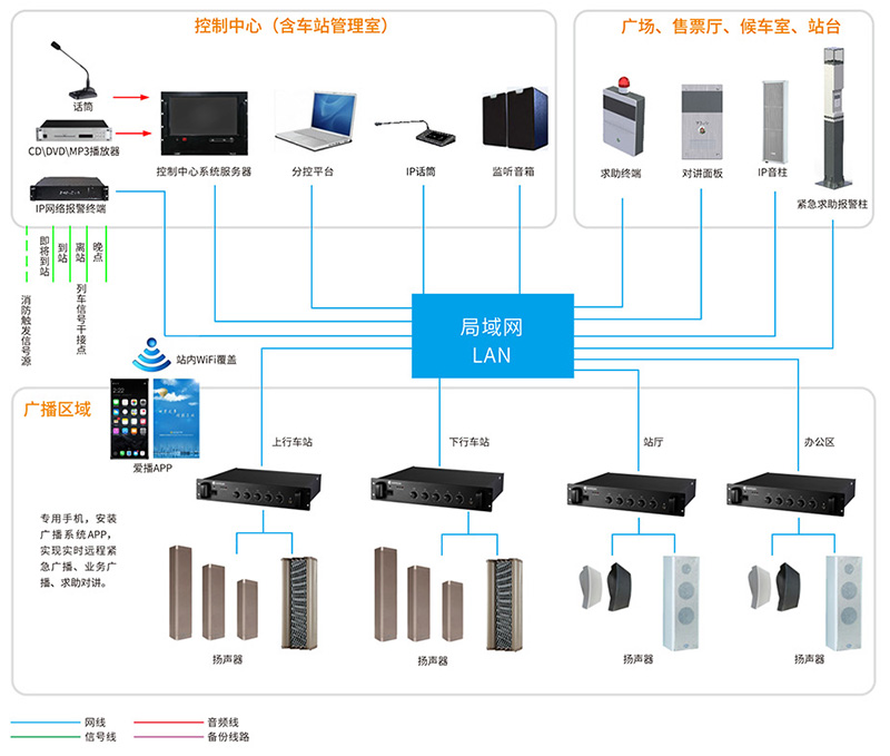 我司軌道交通廣播系統(tǒng)可以應(yīng)用于中央管理室及車站等功能復(fù)雜、管理集中的公共場所,可接入軌道交通的網(wǎng)絡(luò),協(xié) 調(diào)管理,實現(xiàn)列車進出站廣播、尋呼廣播、站臺巡視廣播,環(huán)境噪聲檢測、自動調(diào)音,系統(tǒng)遠程監(jiān)控、故障檢測、緊急廣 播、緊急通訊等功能。
