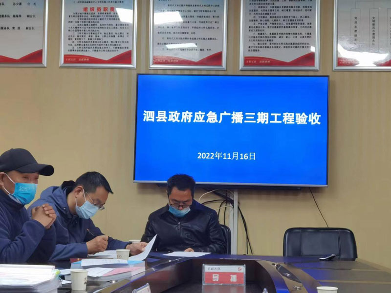 2022年11月16日,由我公司承建的泗縣政府應急廣播三期工程驗收會議在泗縣融媒體中心召開,我公司副總經(jīng)理魏鋼向?qū)<医M匯報了項目實施過程和資料準備工作,經(jīng)過專家的現(xiàn)場檢查和對終驗資料的嚴格評審,該項目順利通過終驗。