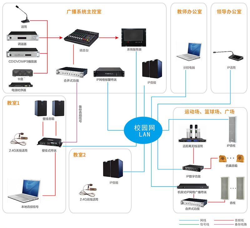 系統(tǒng)能滿足學校廣播的基本功能,可覆蓋校內(nèi)所有區(qū)域;有音頻備份系統(tǒng),可無縫切換,滿足教育局聽力考試要求; 系統(tǒng)操作簡單,易用性強,有可擴展的二次開發(fā)接口,便于和學校的教務或教學系統(tǒng)以及消防系統(tǒng)等其它安防系統(tǒng)融合應 用,方便升級,易于擴展。
